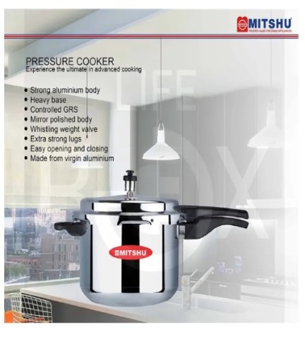 Mitshu Pressure Cooker This pressure cooker will make your cooking effortless and save on both time as well as fuel. The pressure cooker is made of aluminum and comes with an induction base so that you can use it on induction cooktops and cook delicious everyday meals conveniently. Powder coated pan supports are known for durable finish standards, reliable performance and rigid construction. Mor...